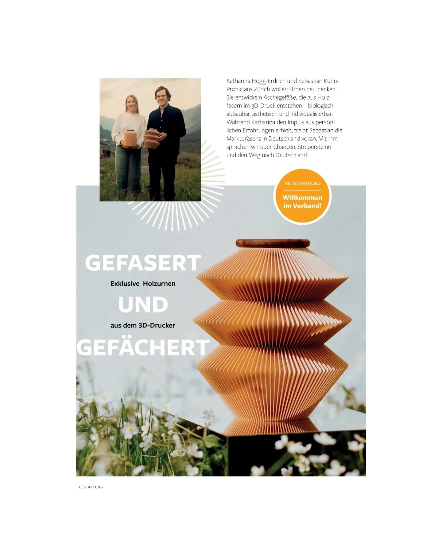 Während eines Gesprächs am Genfersee beschlossen Katharina und Sebastian, sich diesem Thema anzunehmen. Ihre Mission: stilvolle, nachhaltige und personalisierbare Urnen zu entwickeln, die den Abschied neu denken und zeitgemässe Lösungen für eine moderne Bestattungskultur bieten.